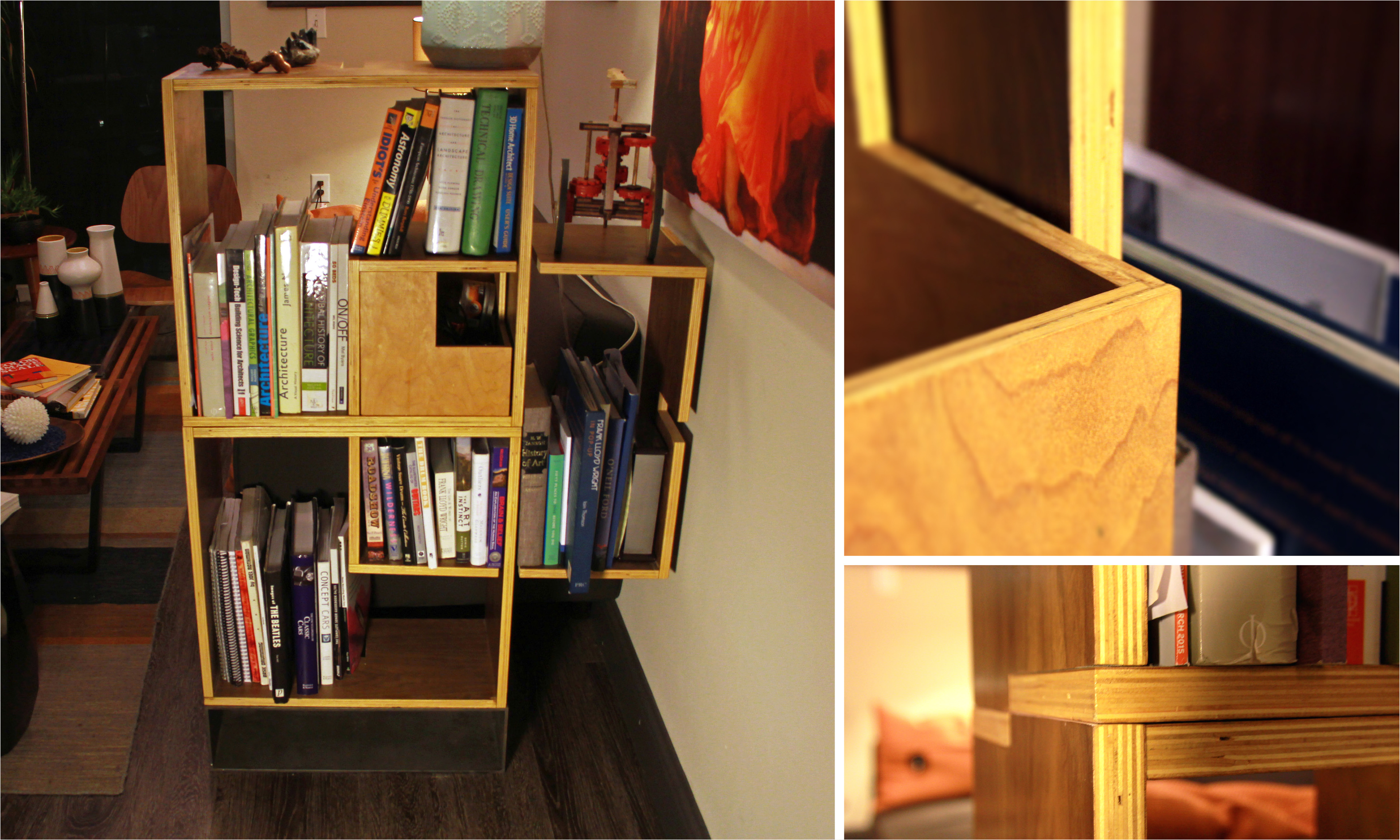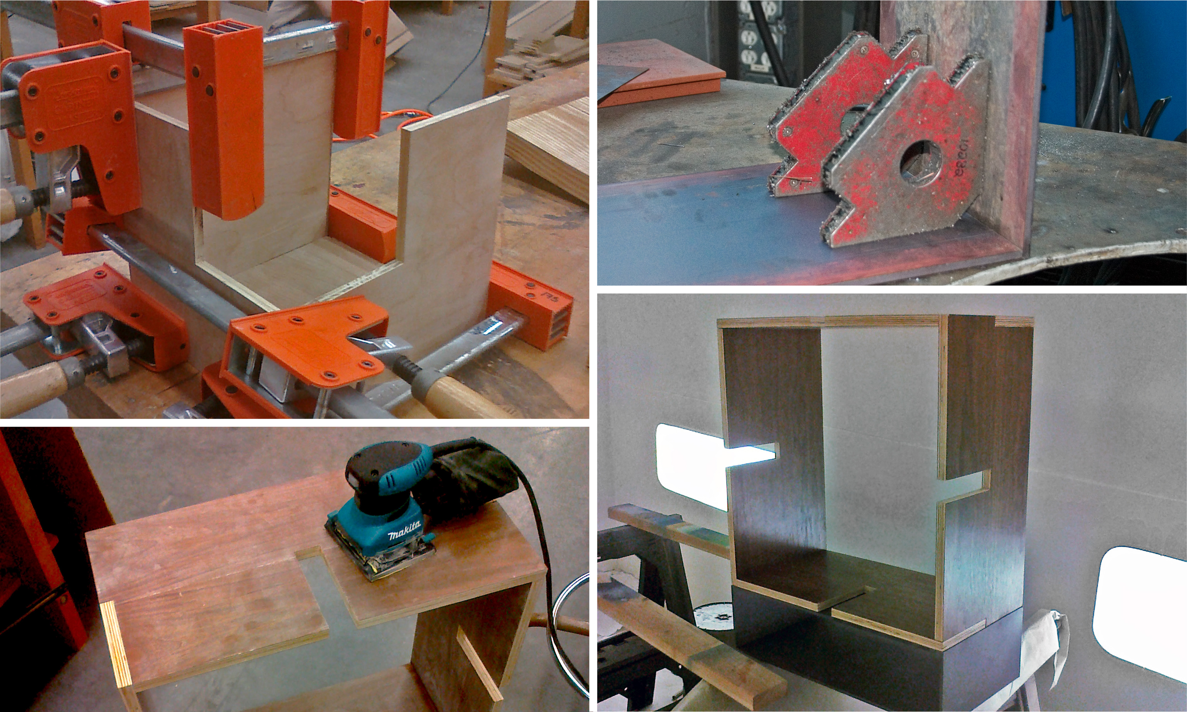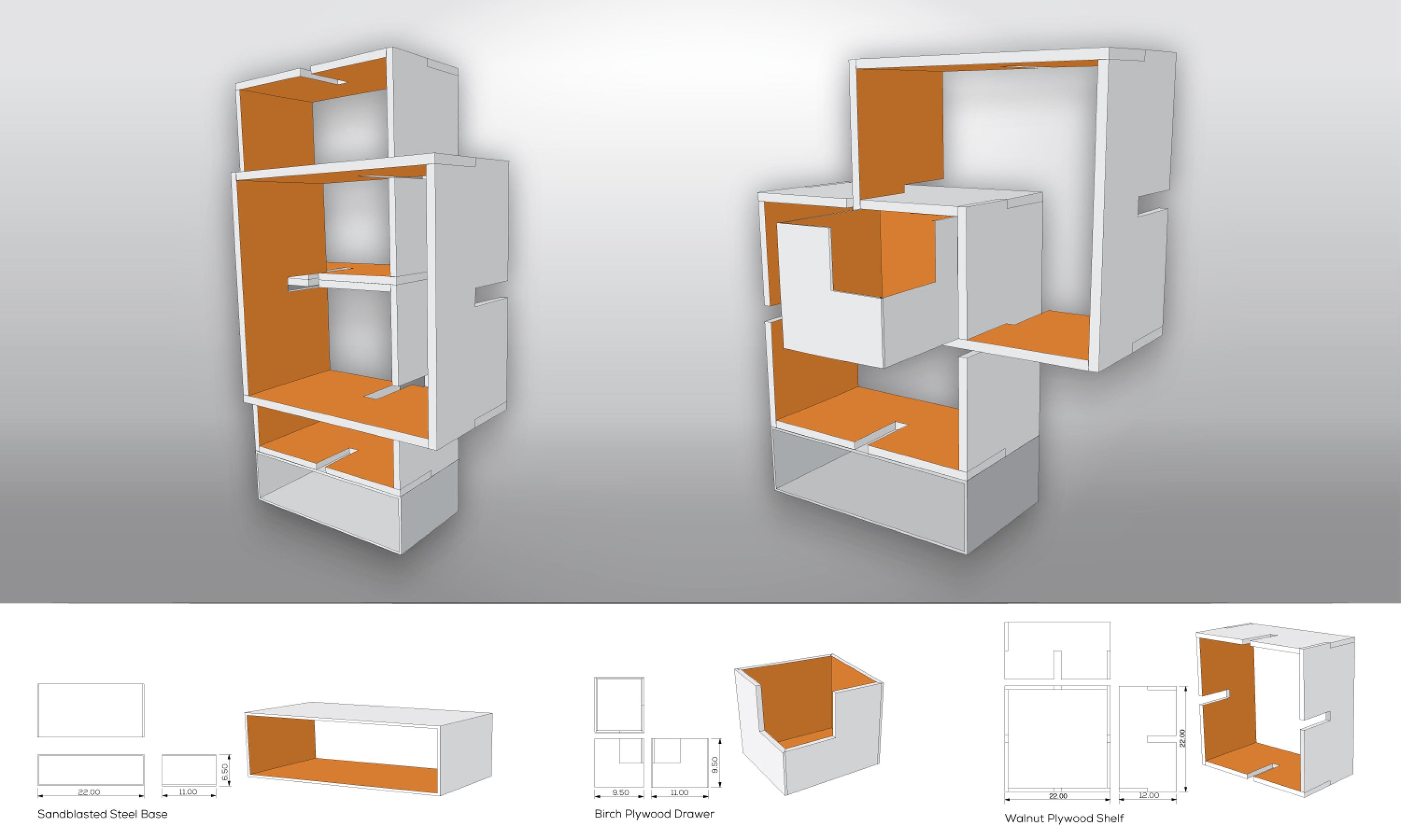 Project constructed for the University of Houston in 2010. Hand-made sample is made out of biscuit-jointed walnut plywood, maple plywood drawer made using tongue and groove, and a TIG welded, sandblasted steel base.